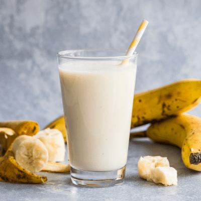 Chop the banana into smaller pieces and put all your ingredients into a blender. Blend on low until everything is mixed and then blend on high for about 20 seconds to make your smoothie fluffy.